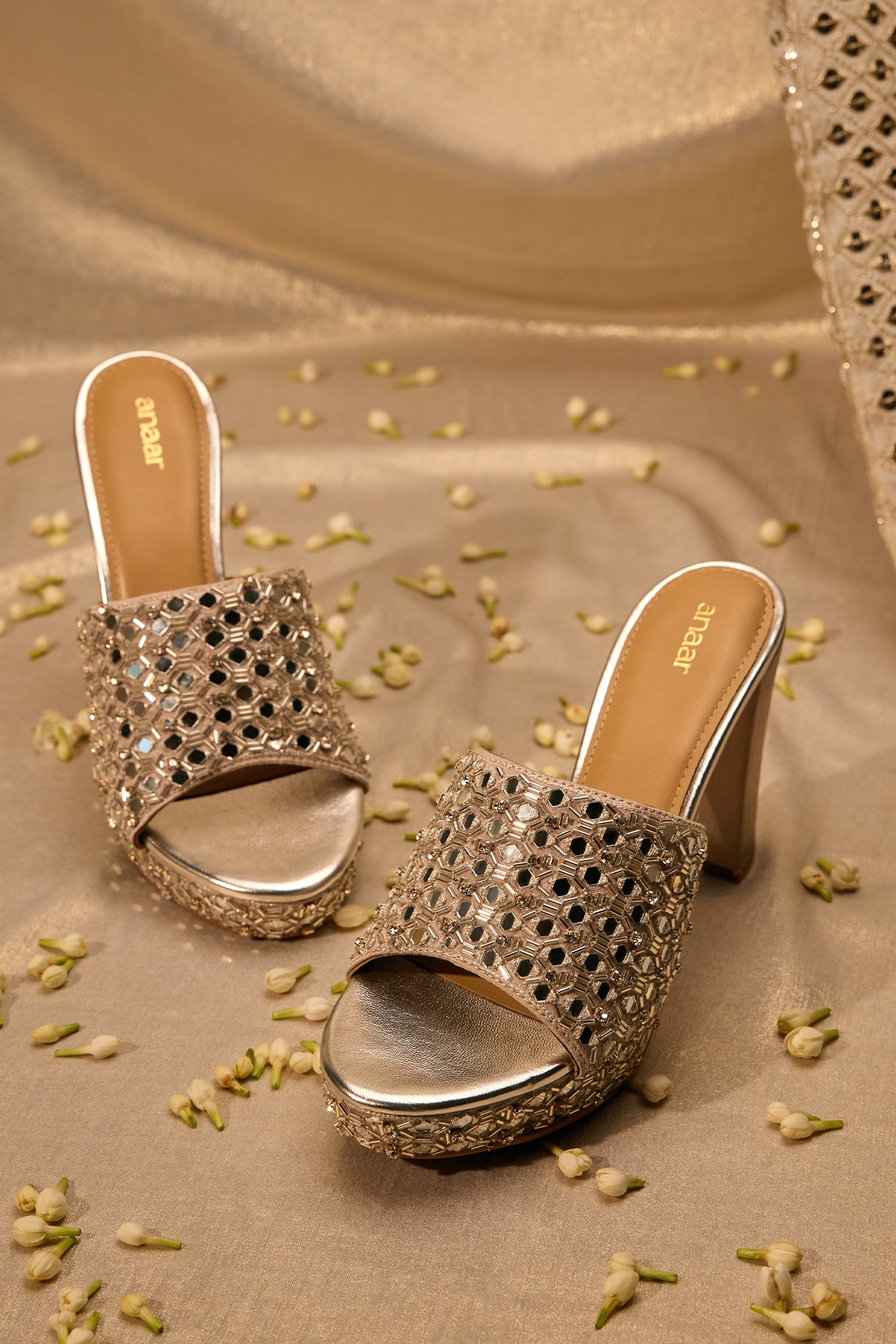 Designed to dazzle yet built for ease, the metallic base and cushioned footbed make this pair the ideal choice for long Diwali nights, festive gatherings, and wedding celebrations.