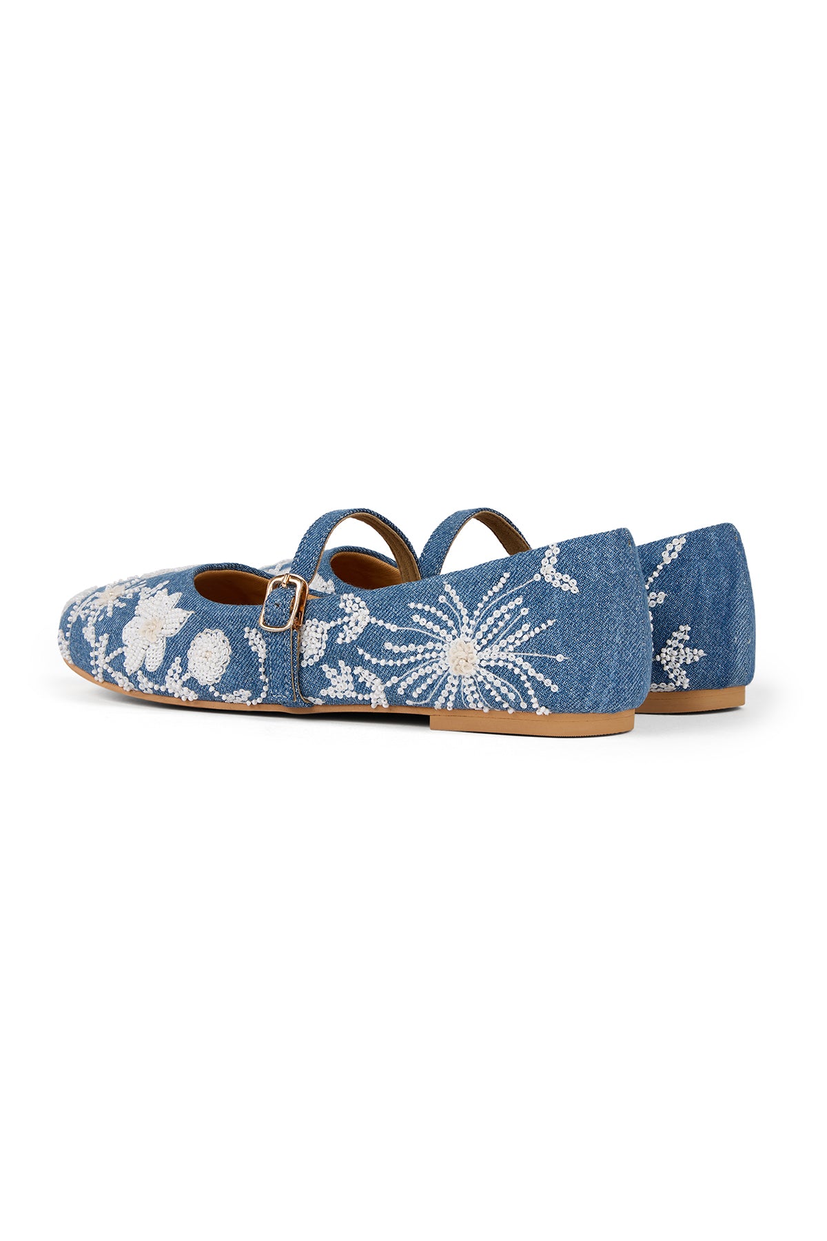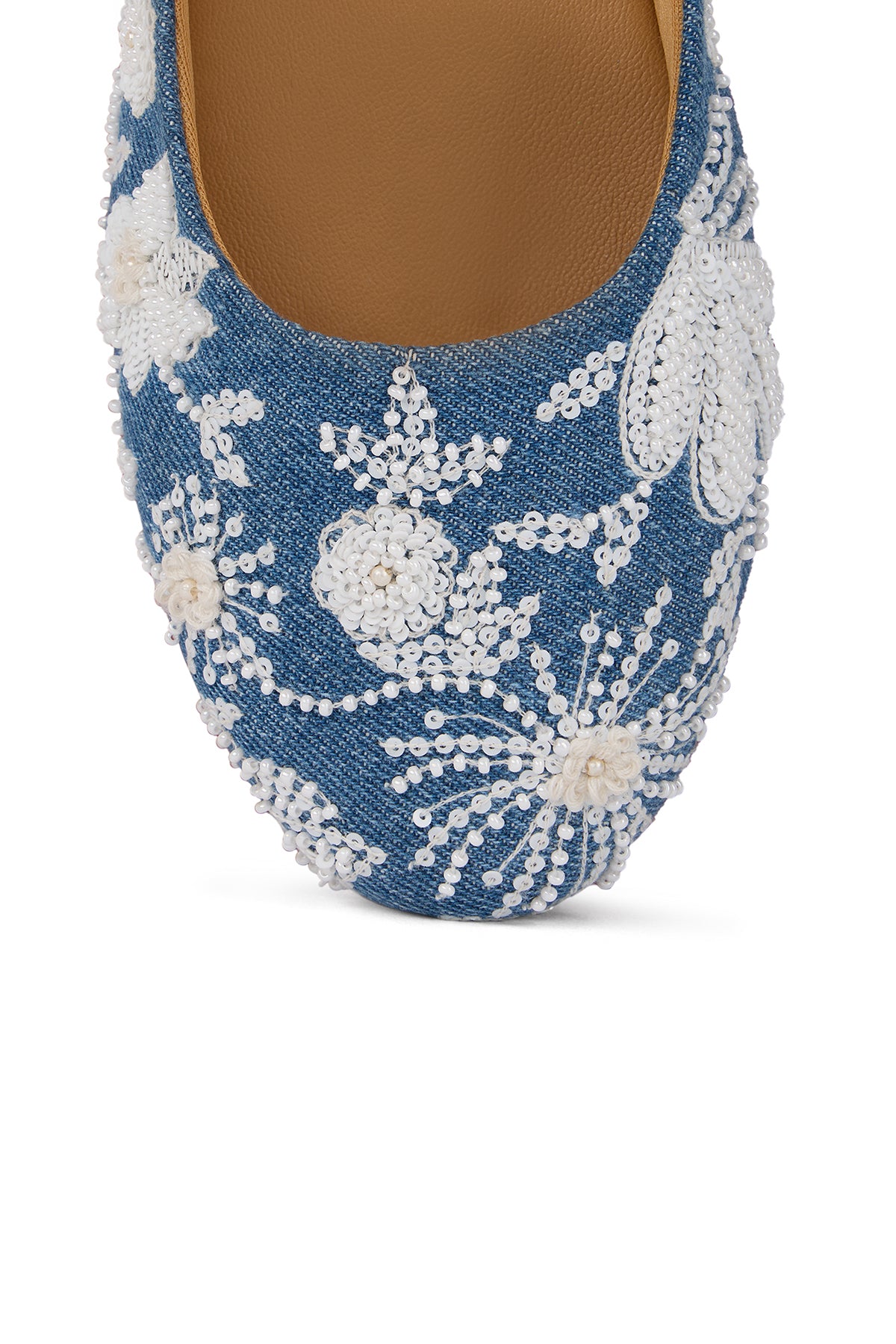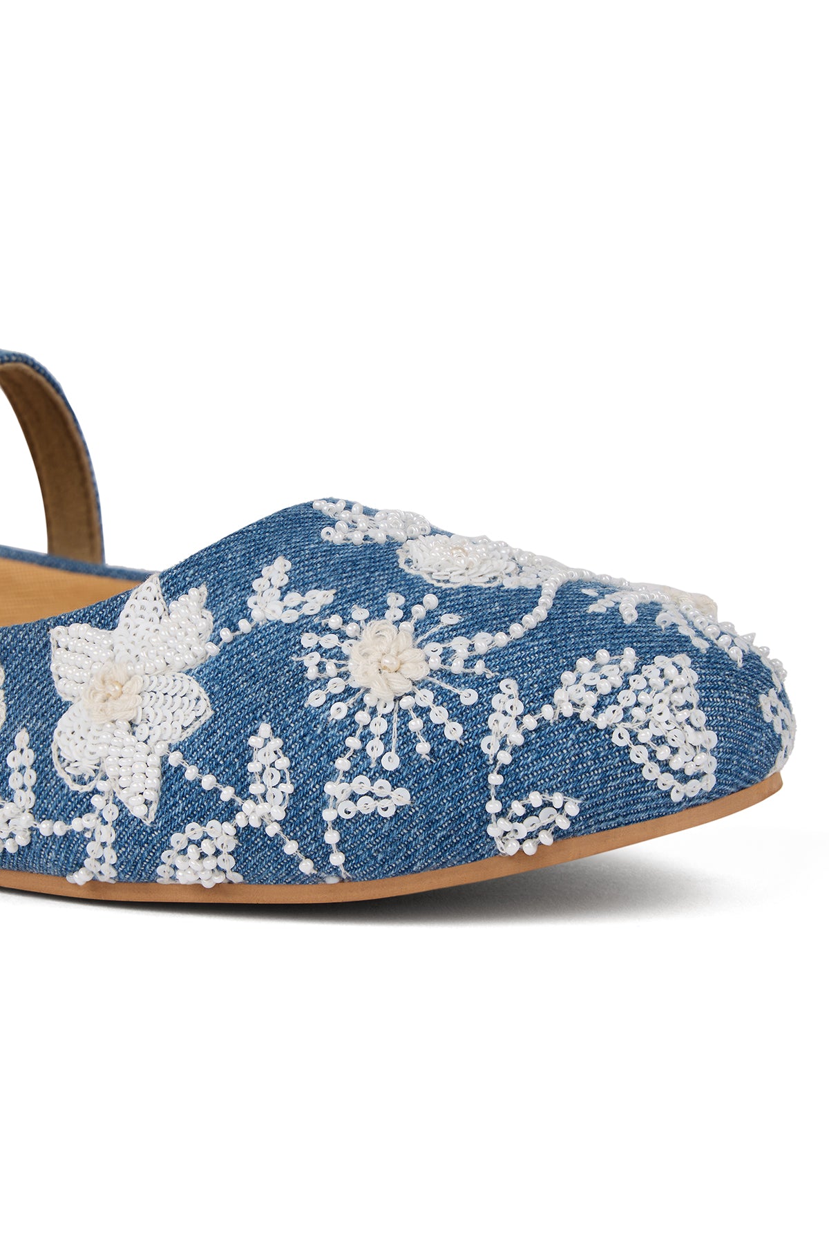Our Kashmir Kehwa Ballerinas is crafted from denim and adorned with delicate white floral embroidery, threadwork, mini pearls and sequins. Light, breezy and effortlessly charming—what more do you want for a stylish summer day? Every detail of this pair blooms with the floral soul of Kashmir, and that's what makes its beauty linger long after you've left the room.