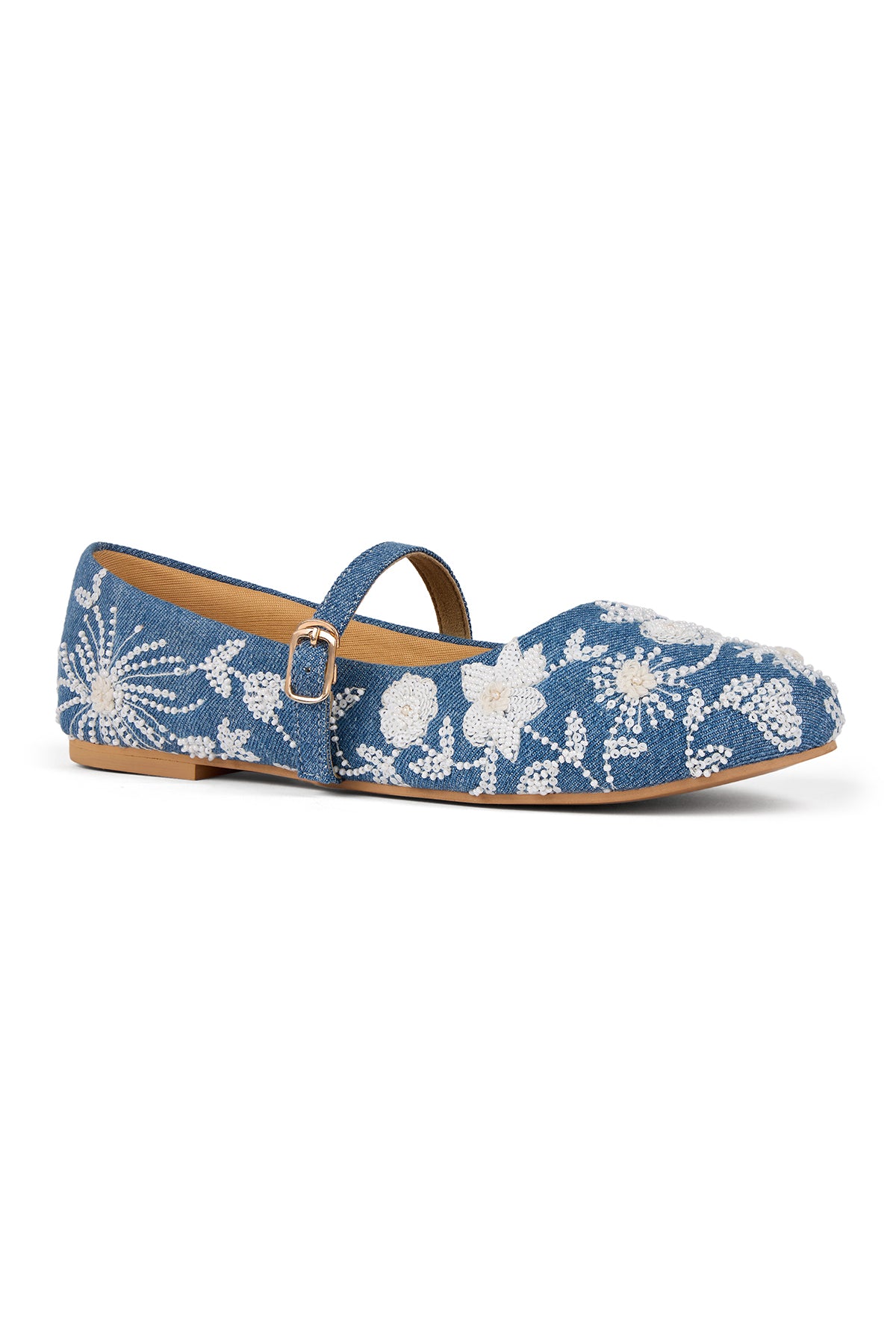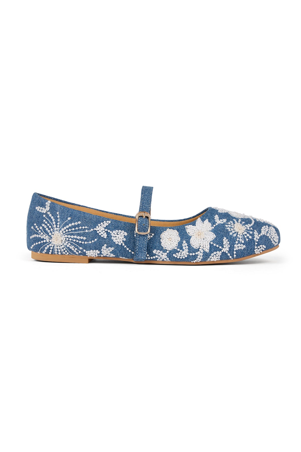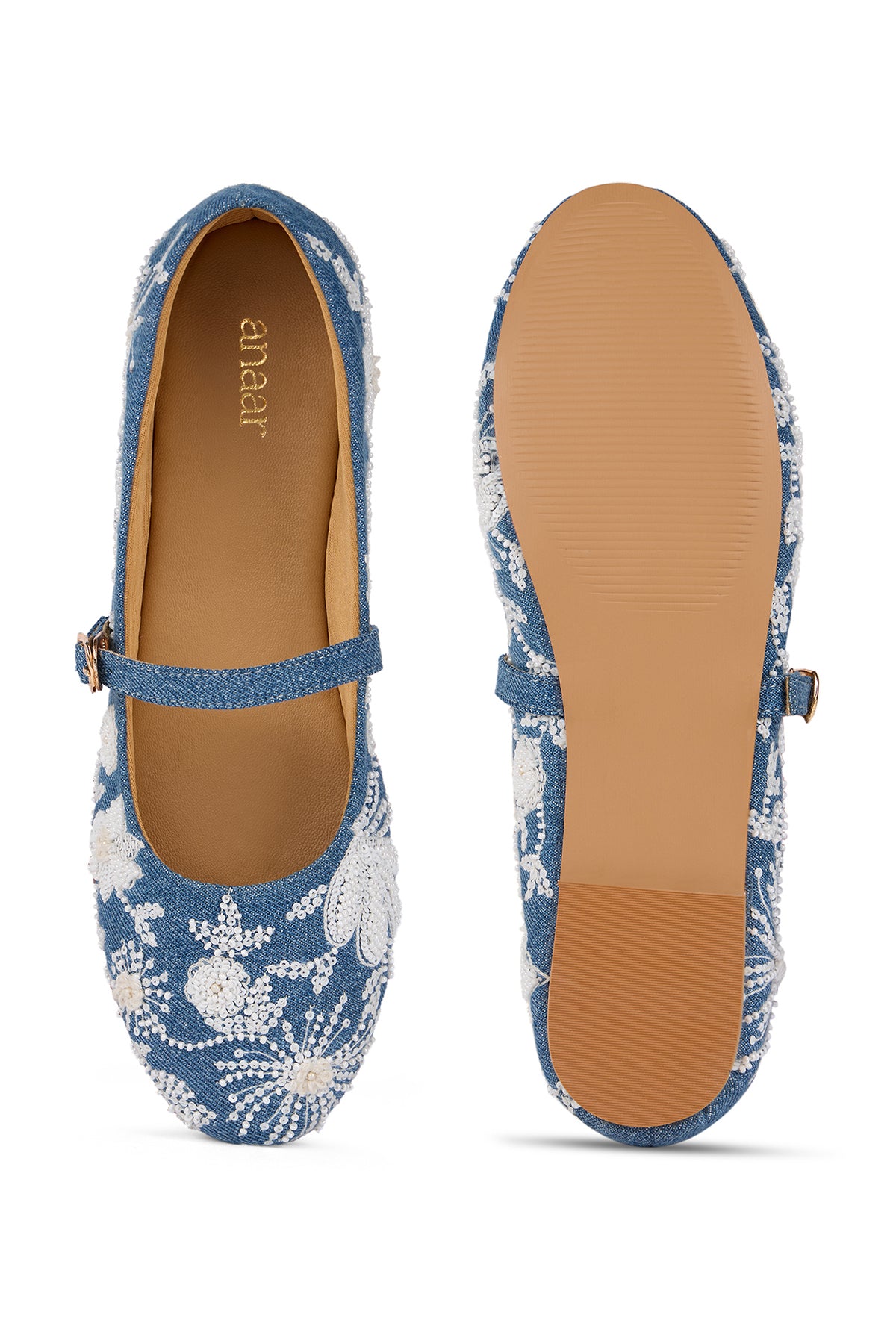 Our Kashmir Kehwa Ballerinas is crafted from denim and adorned with delicate white floral embroidery, threadwork, mini pearls and sequins. Light, breezy and effortlessly charming—what more do you want for a stylish summer day? Every detail of this pair blooms with the floral soul of Kashmir, and that's what makes its beauty linger long after you've left the room.