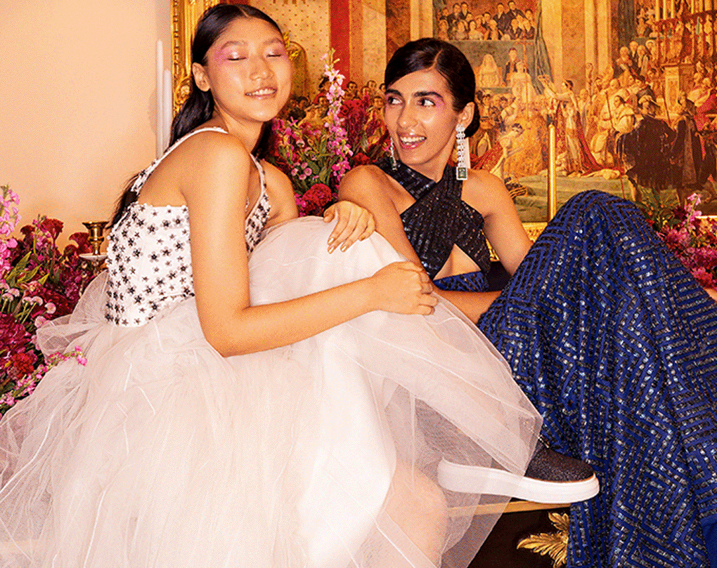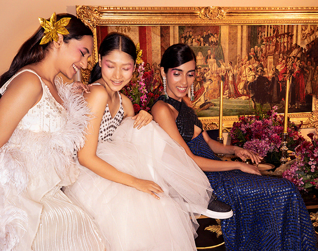 When it comes to bringing the party to your feet, Anaar knows how to nail it. Just take a look at Masquerade classic sneakers women. These shoes are bound to be the centre of attention in any room you walk into. Taking inspiration from a masquerade ball, an alluring black canvas is used to make the geometric golden pattern pop on these classic sneakers for women. The intricate gota work has really found a place to shine on this piece. These shoes are perfect for a femme fatale who loves to party.