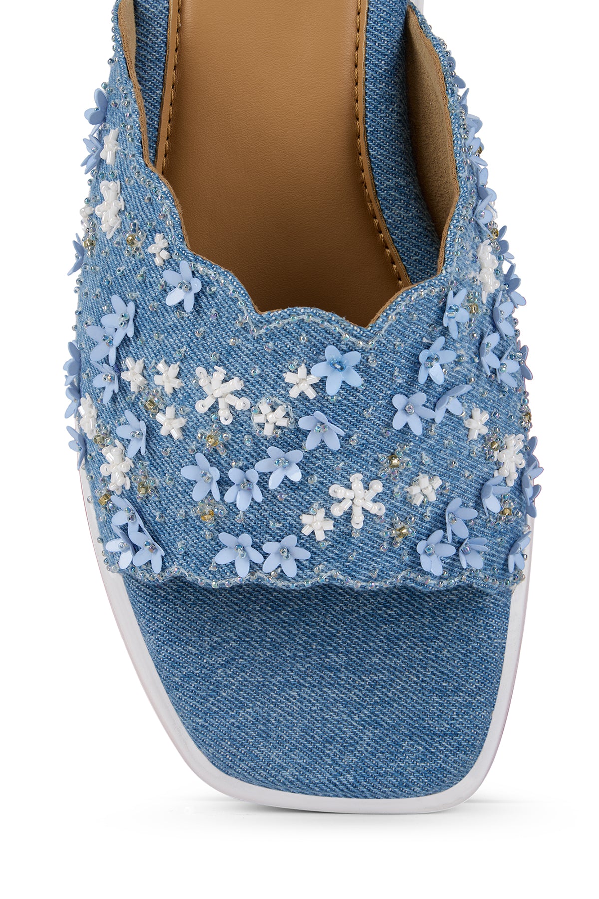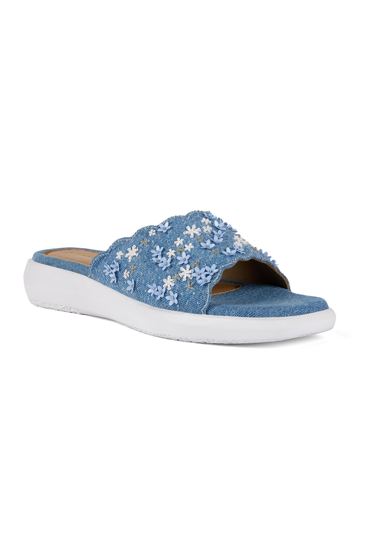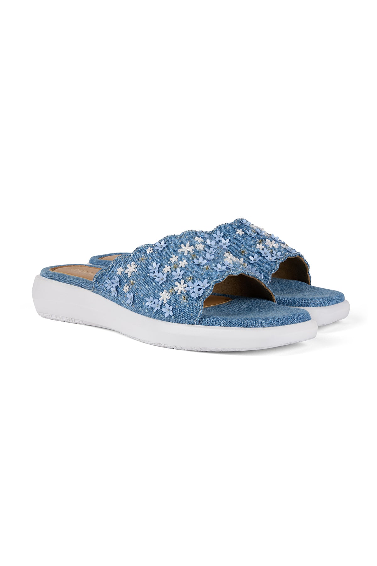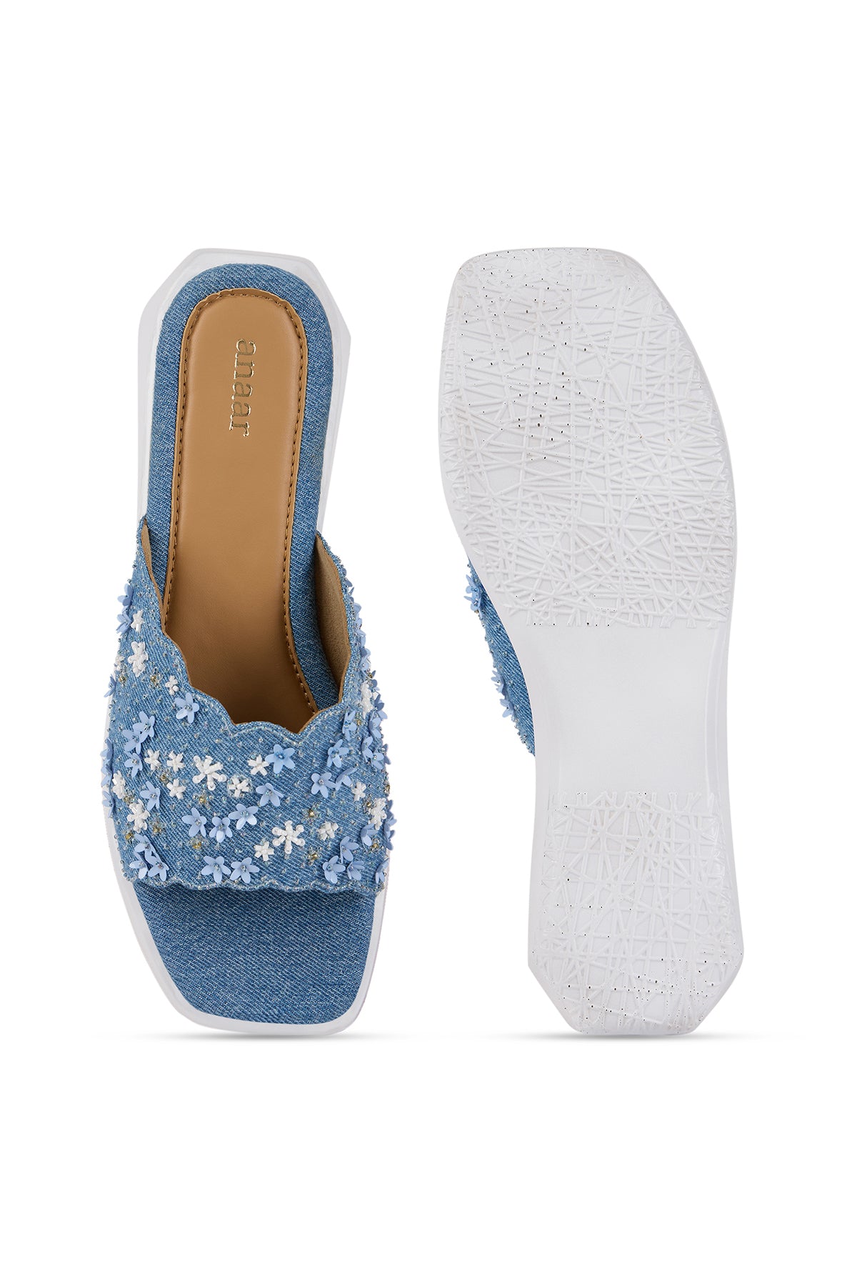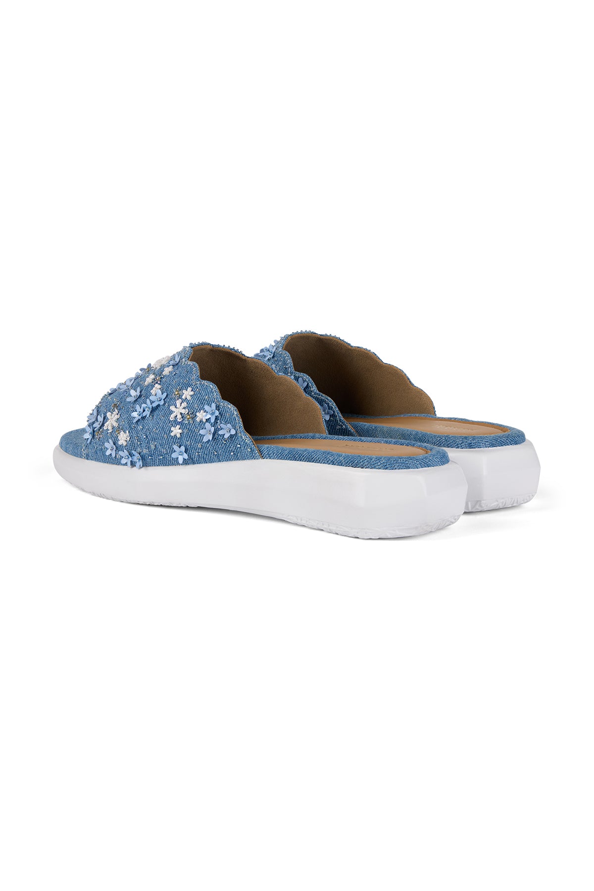Our Florique sandals are your summer feet's best friend. They are crafted from denim and adorned with delicate floral embroidery. The embroidery is a mix of flower-shaped sequins, small sequins, cutdana work and mini pearls.