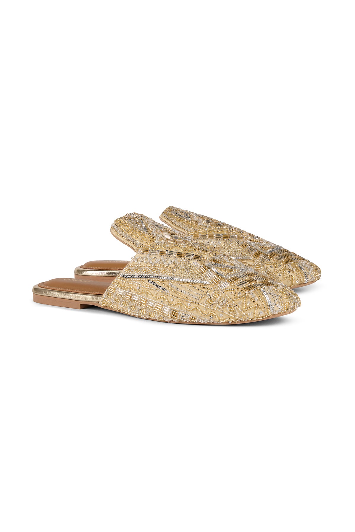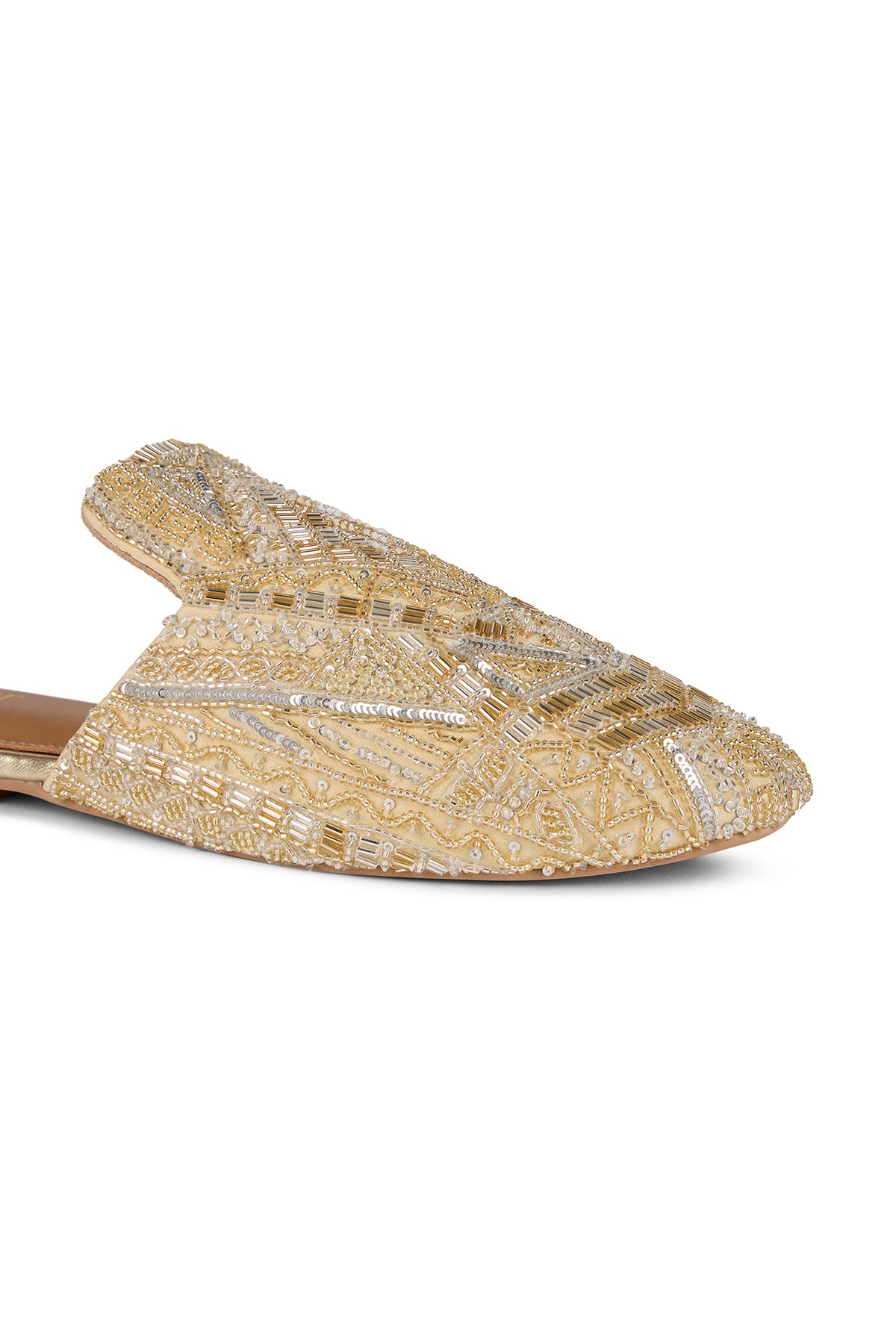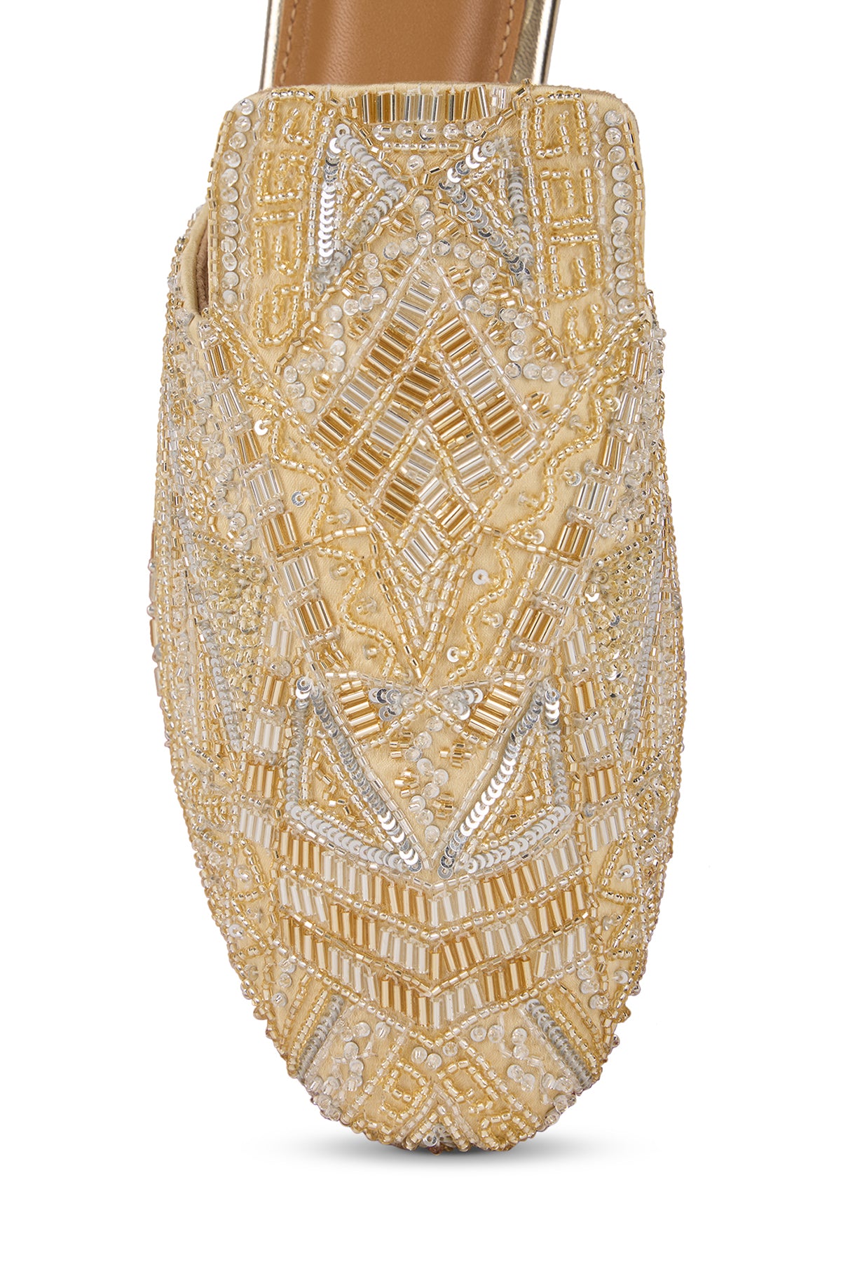 Our Queen mules are crafted from luxurious satin and embellished with cutdana work, salli embroidery, mini pearls and sequins. Each shoe features intricate geometric patterns created with beadwork in soft gold and silver tones.