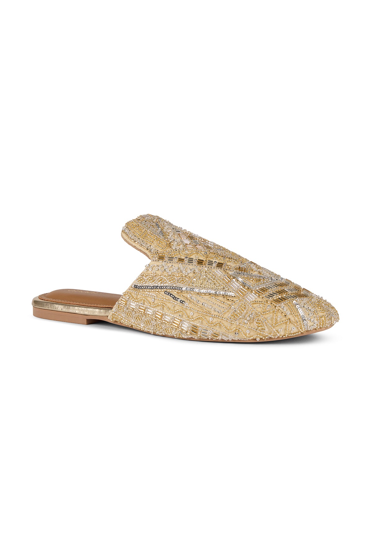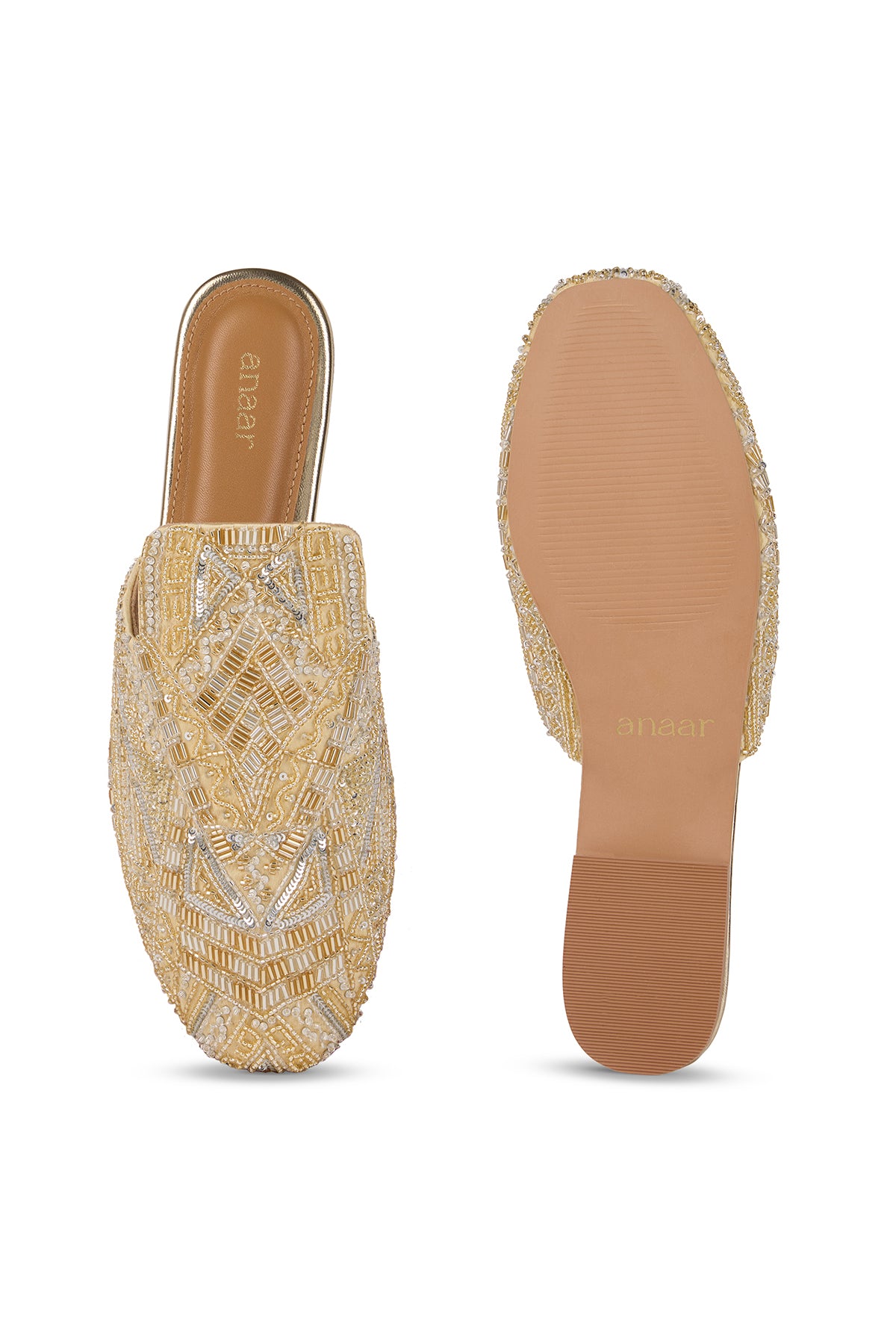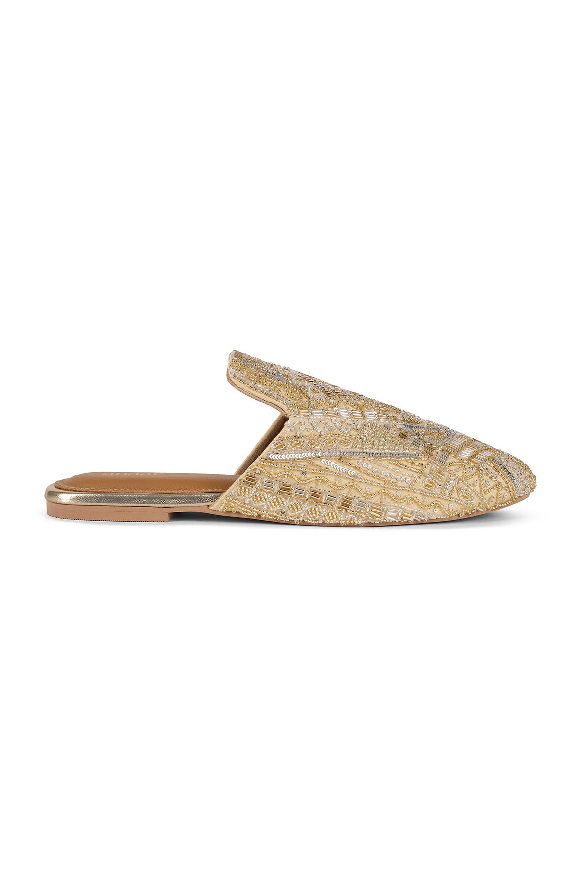 Our Queen mules are crafted from luxurious satin and embellished with cutdana work, salli embroidery, mini pearls and sequins. Each shoe features intricate geometric patterns created with beadwork in soft gold and silver tones.