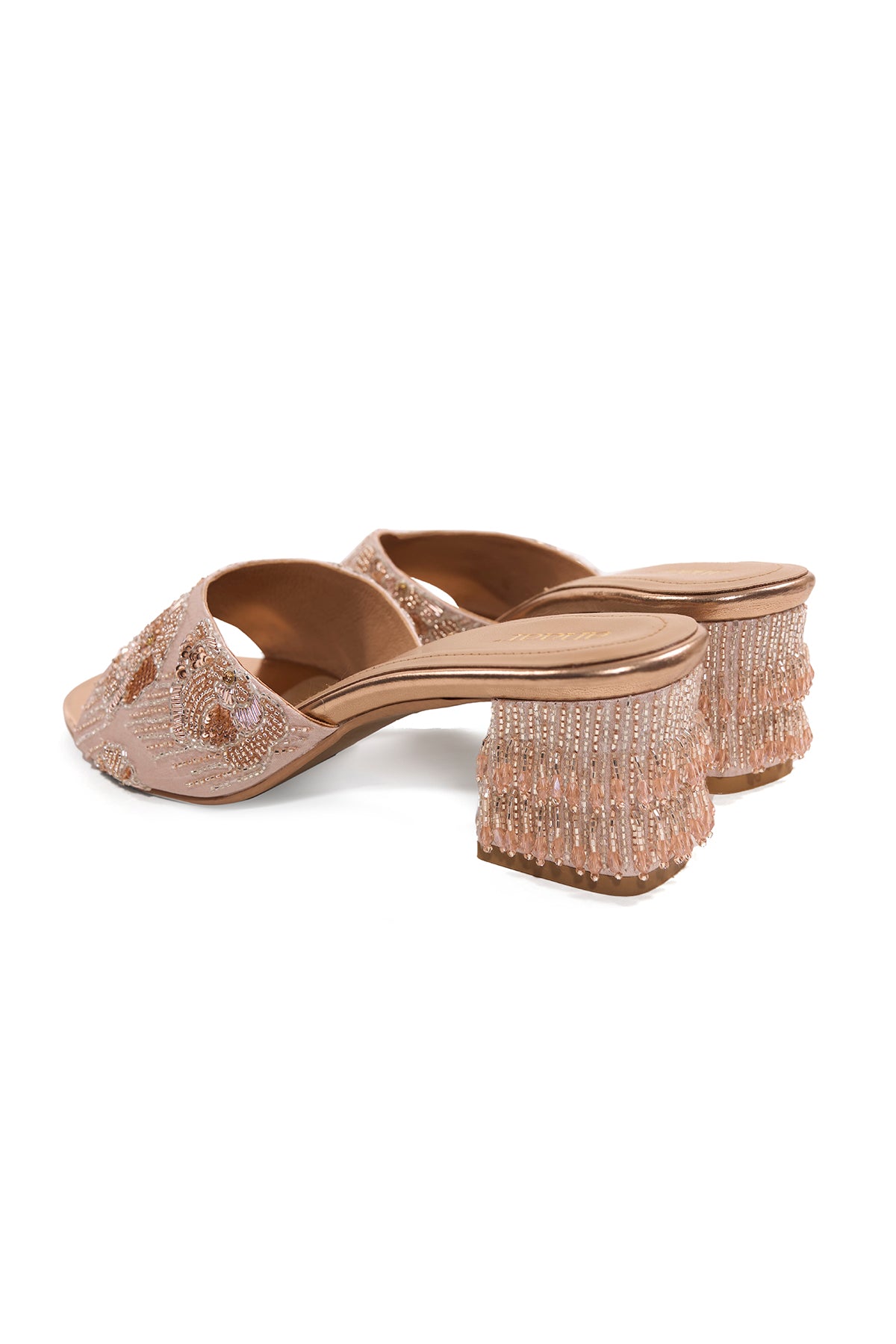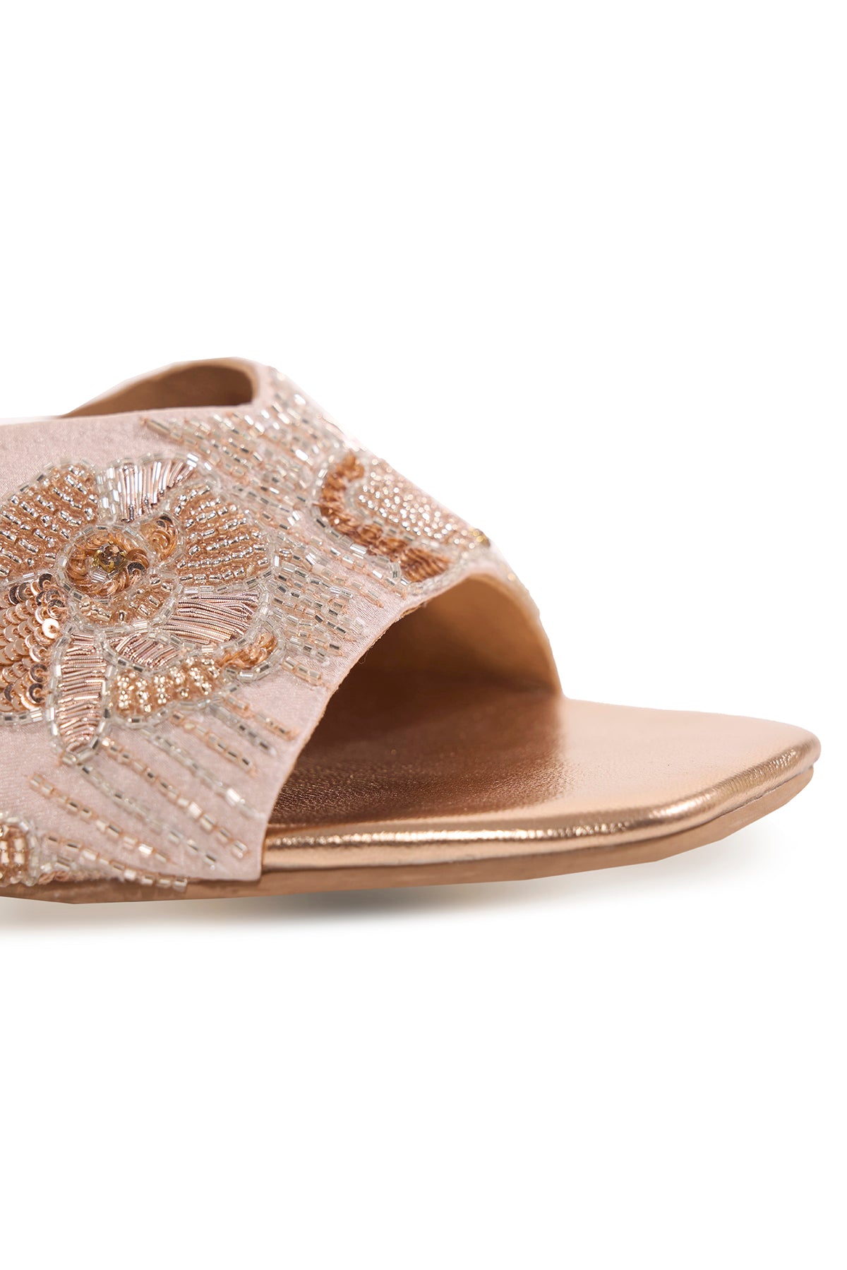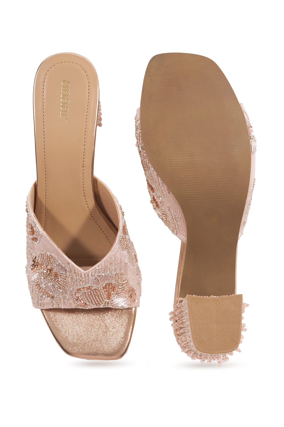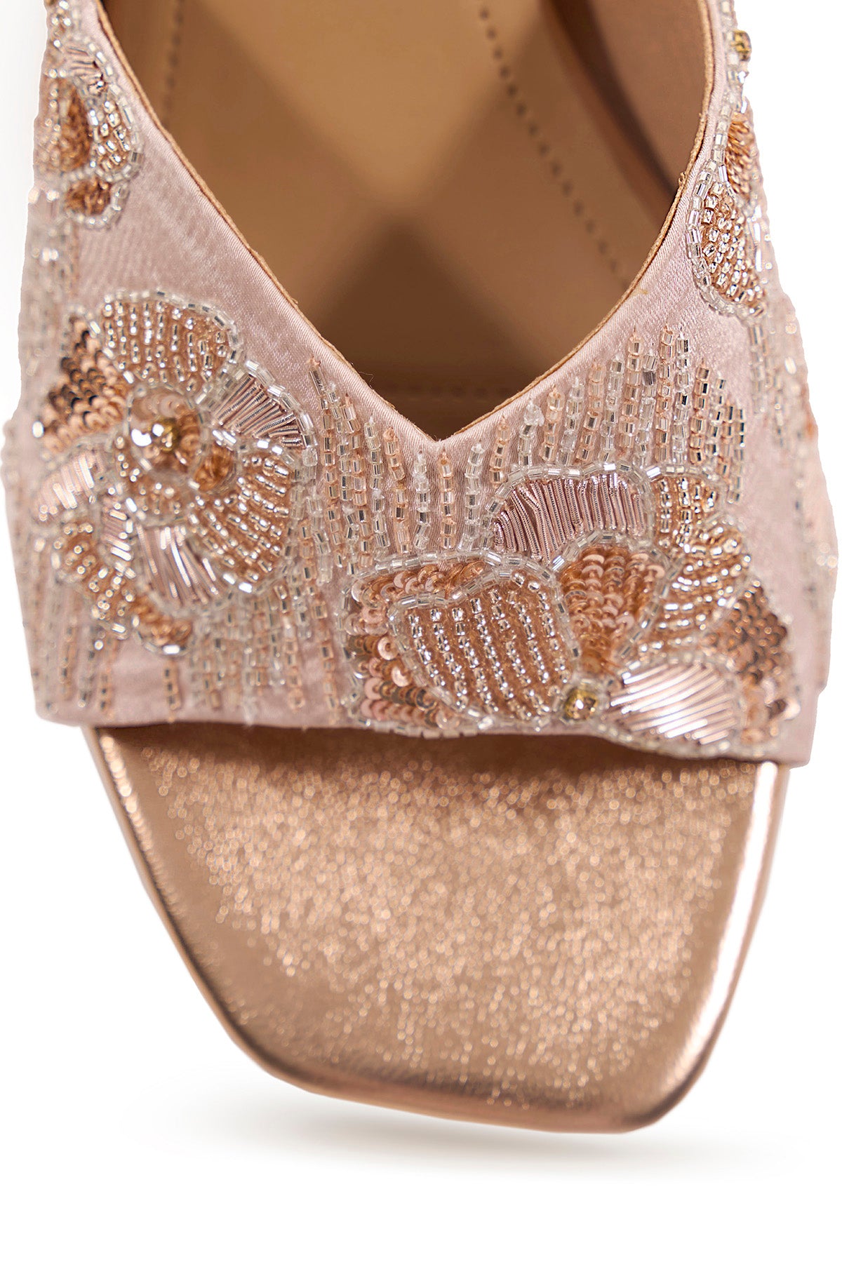 Each motif is brought to life with rose-gold cutdana work, shimmering sequins, tiny rhinestones, and dewdrop-shaped beads. Silver cutdana embroidery outlines every flower, making it bloom even brighter. All this detailed handwork graces the satin straps and even the heel, which features beaded tassels, turning every step into a moment.