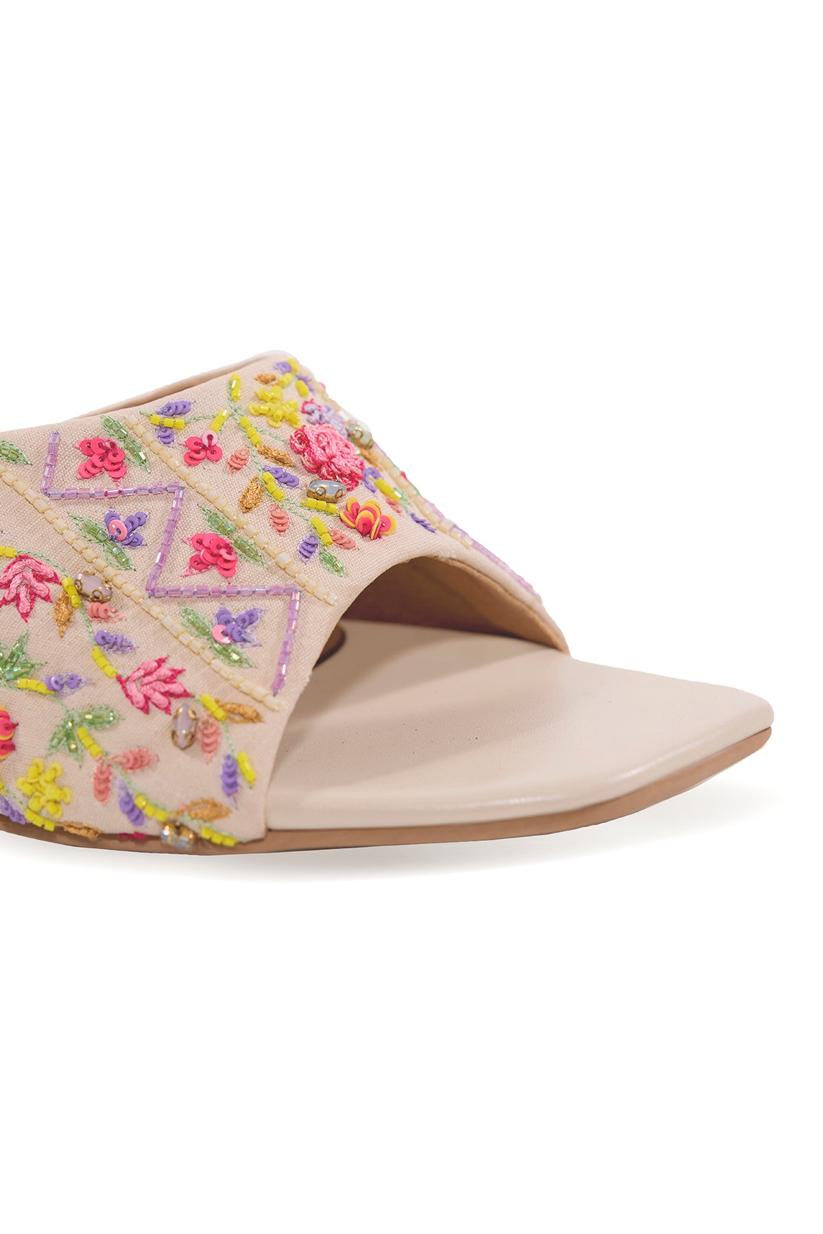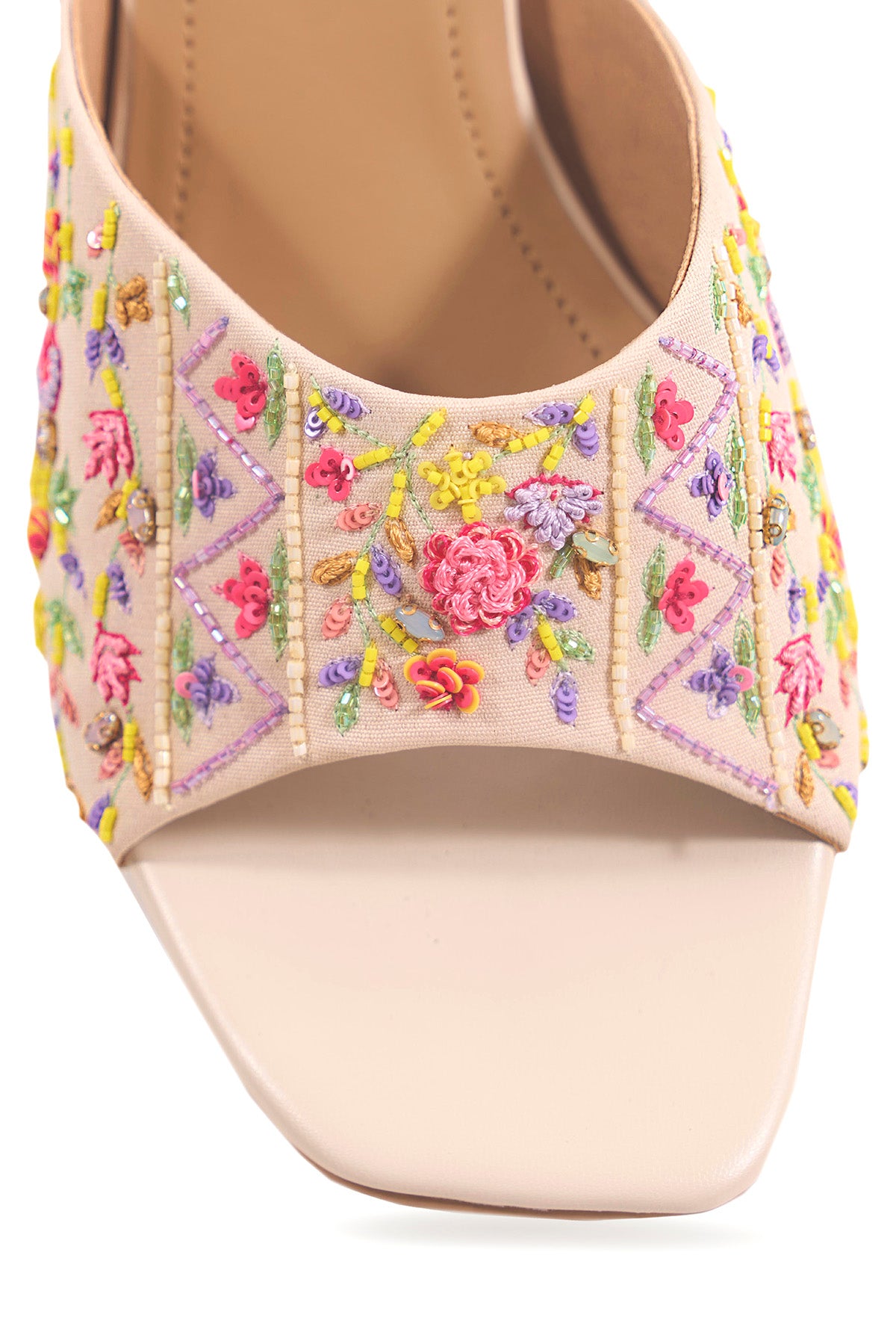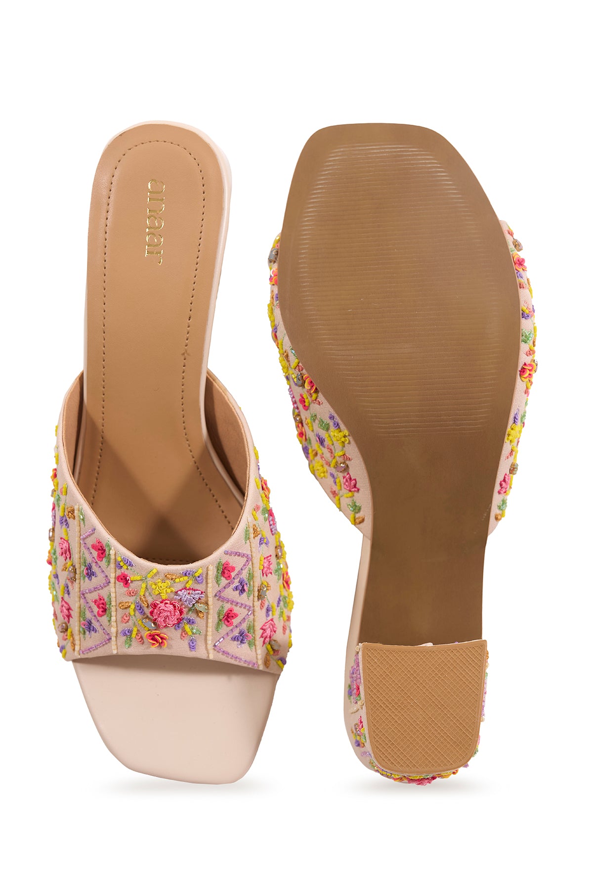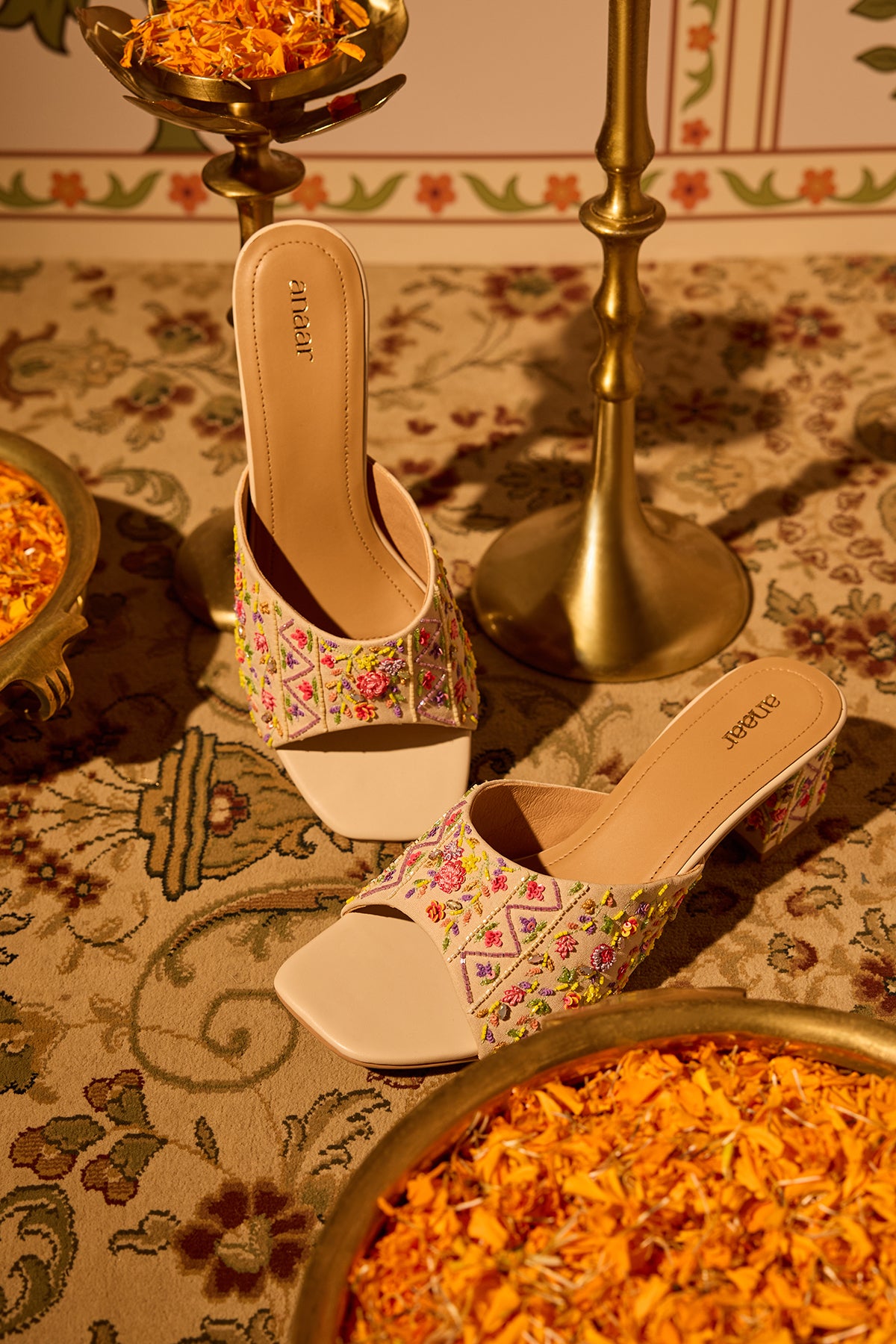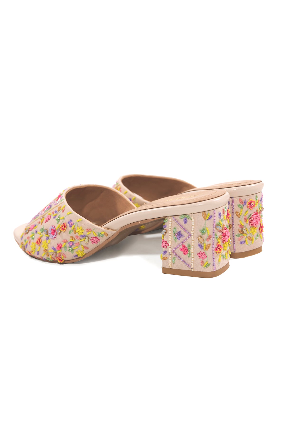 Our Spring Song block heels are crafted from ivory fabric and adorned with multicoloured resham threads and beads that bloom into delicate florals across the strap. This blend of floral and geometric elements reflects Anaar’s philosophy of pairing the modern with the traditional.