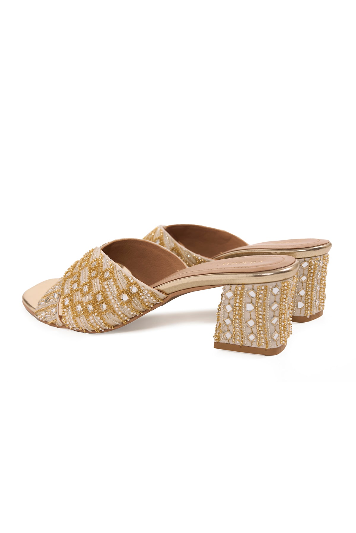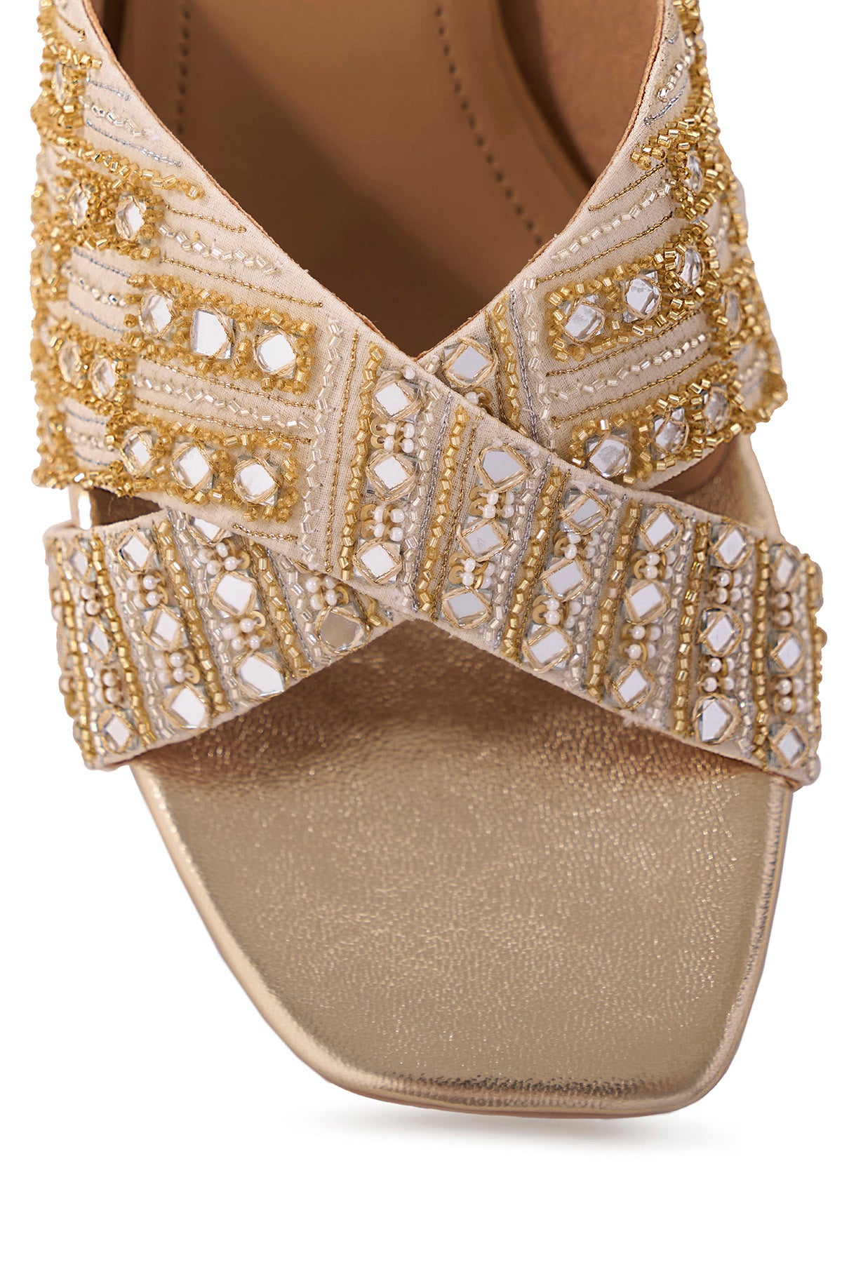 Crafted from textured cotton and embellished with gold and silver zari work, mini ivory pearls, mirrors, sequins, and cutdana embroidery, the detailing cascades all the way down to the block heel, making this pair a true statement piece in your festive wardrobe.