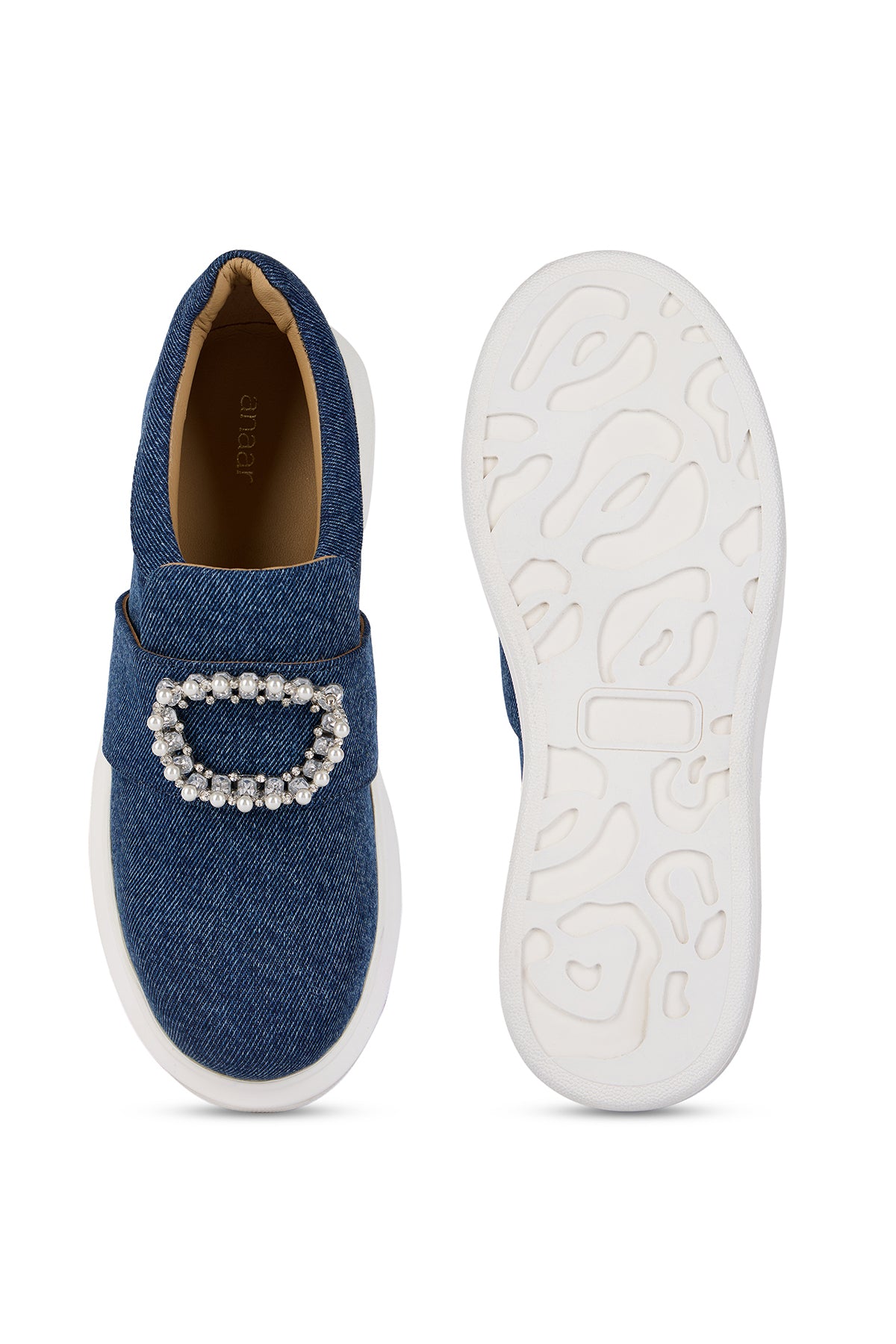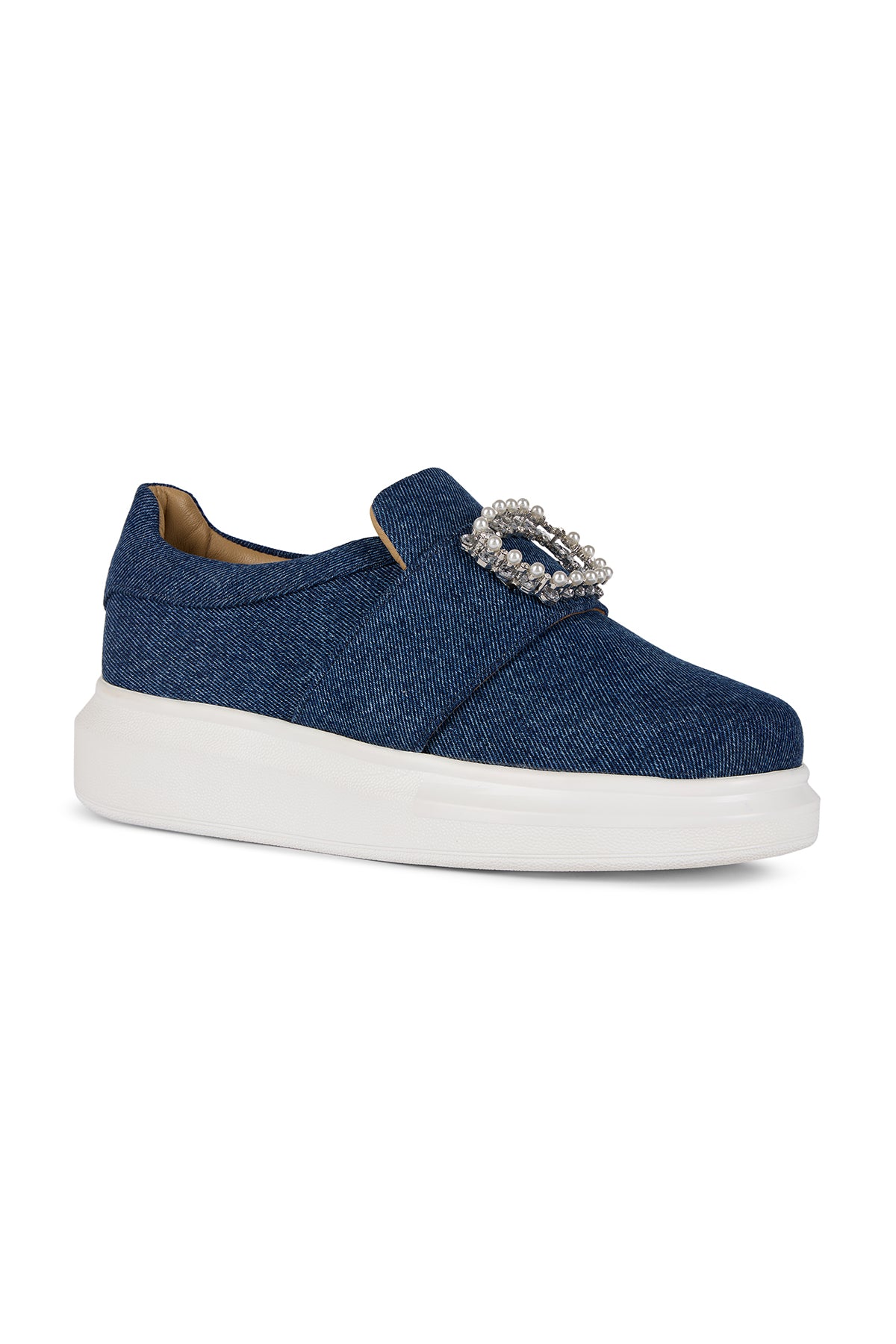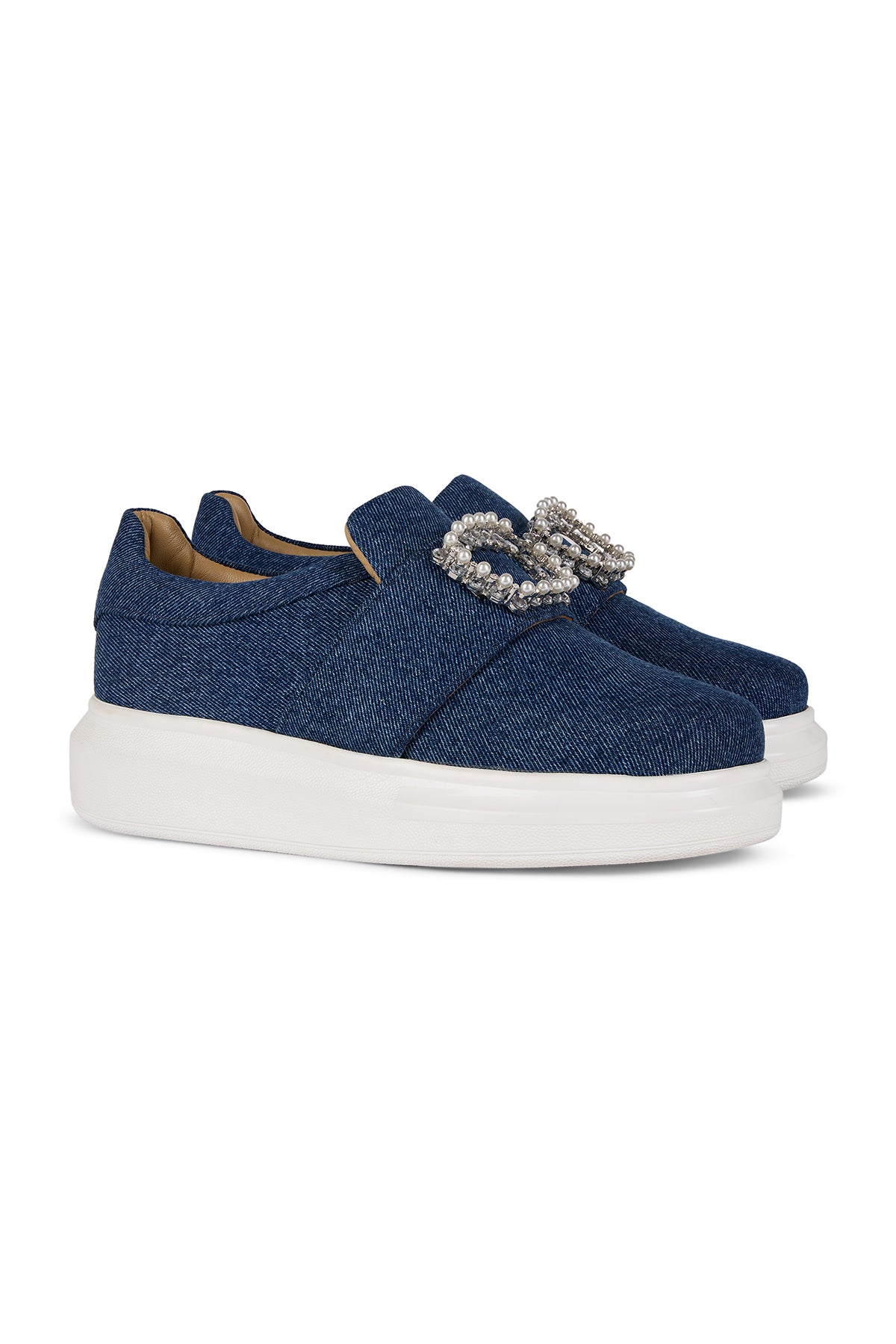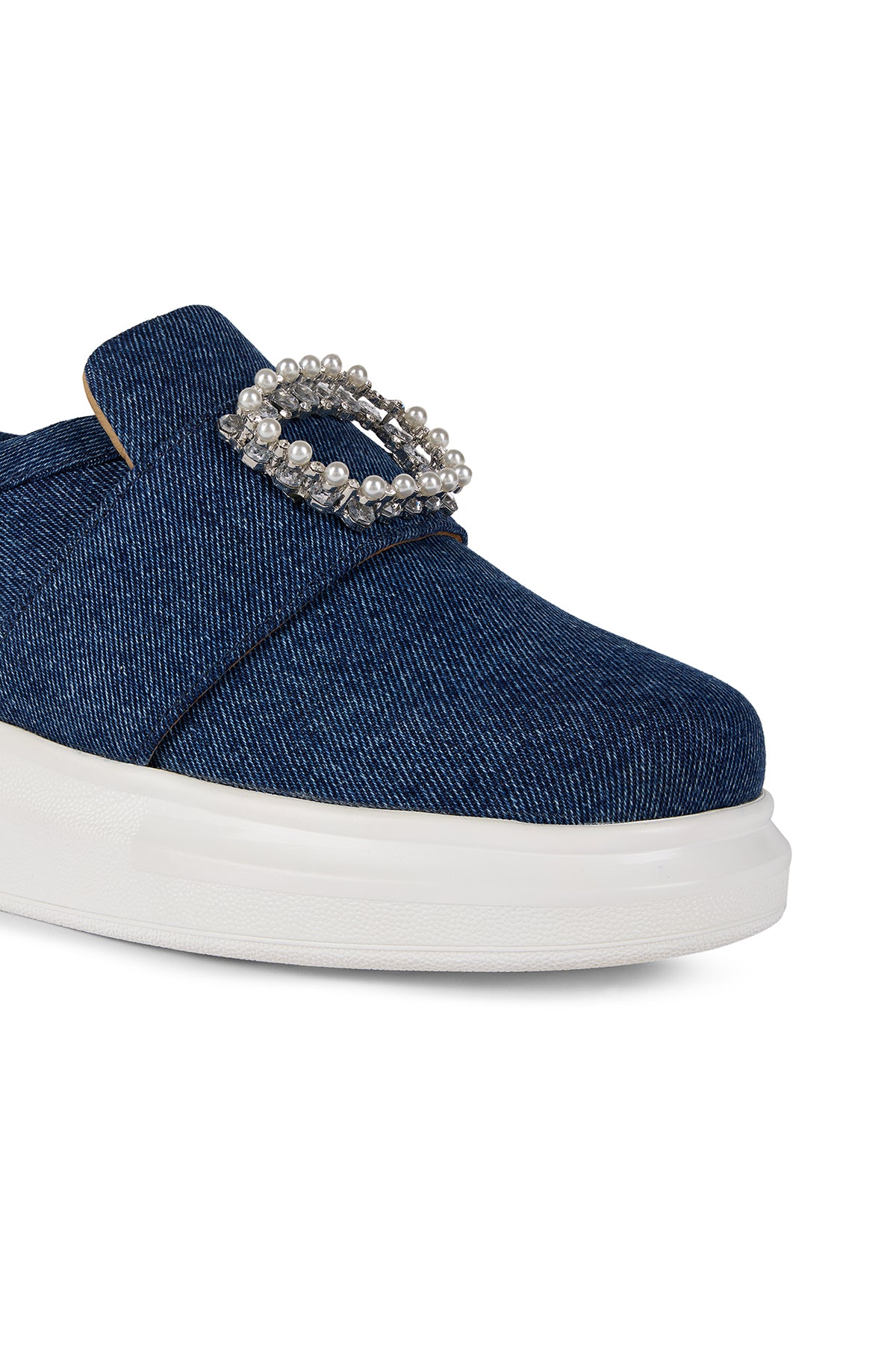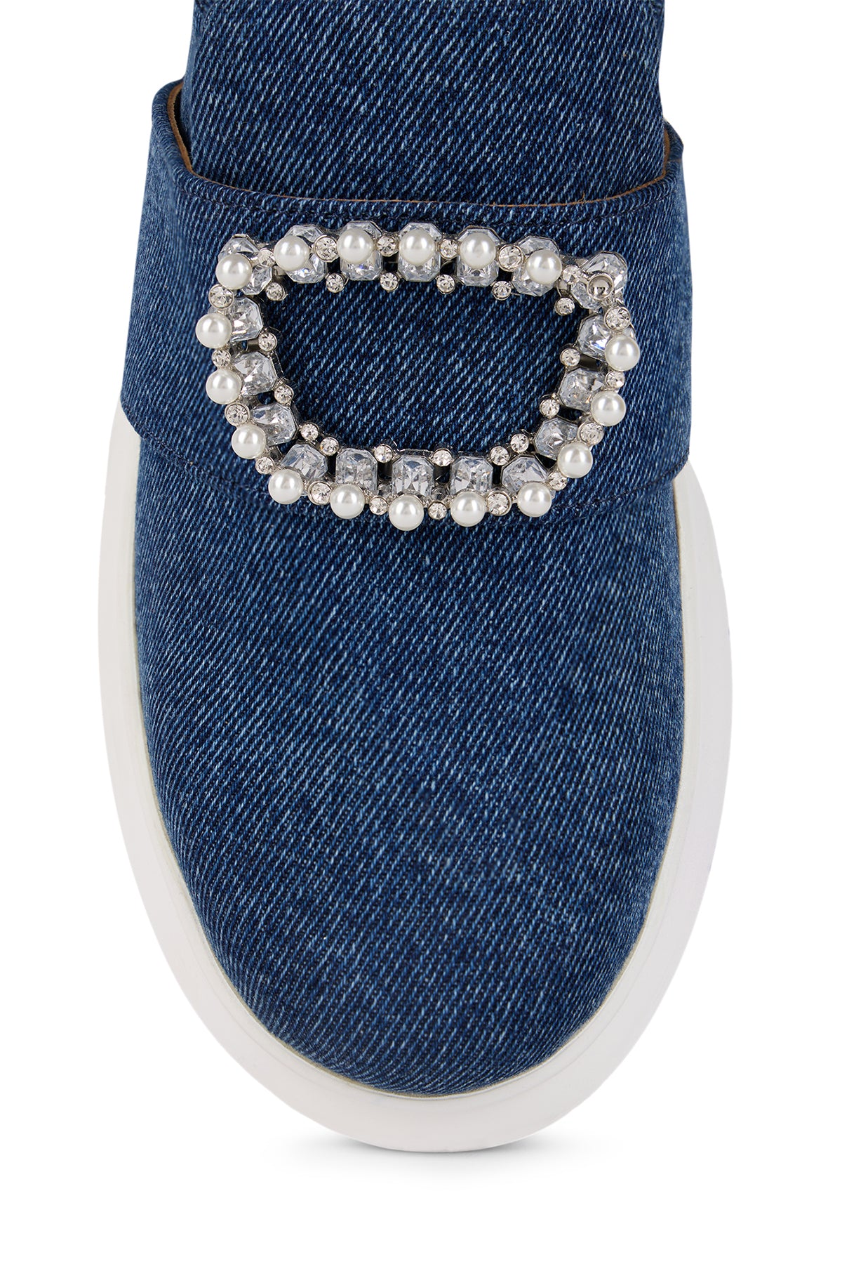 Our Denim Duchess classic sneakers are crafted from rich dark denim and adorned with a statement strap that features a pearl accent.